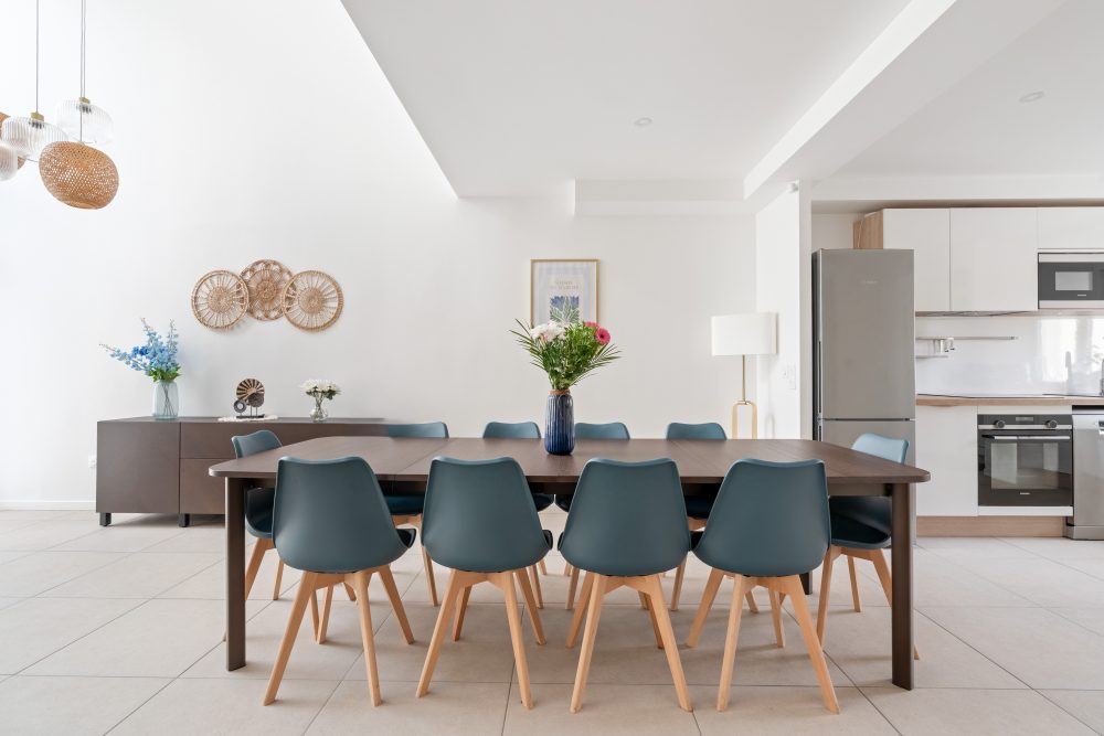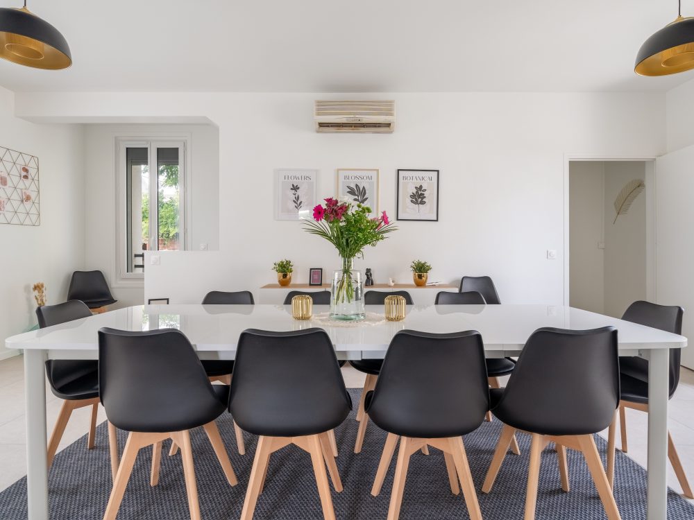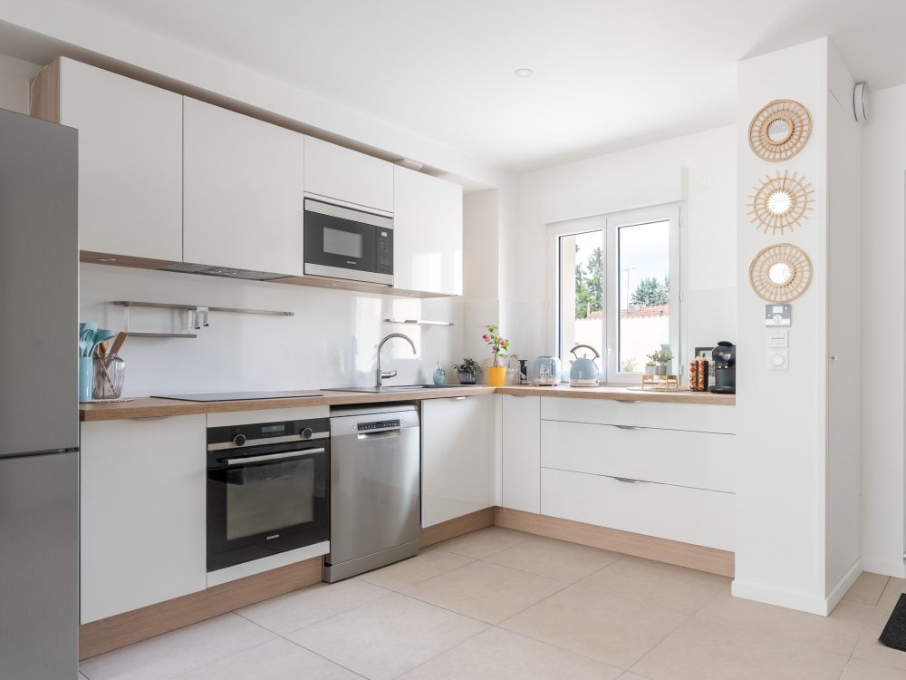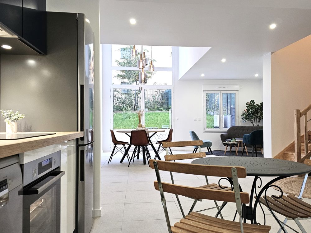 - Cuisine ouverte entièrement équipée, électroménager de grande marque (grand frigo-congélateur, lave-vaisselle, micro-ondes, plaques induction et hotte).