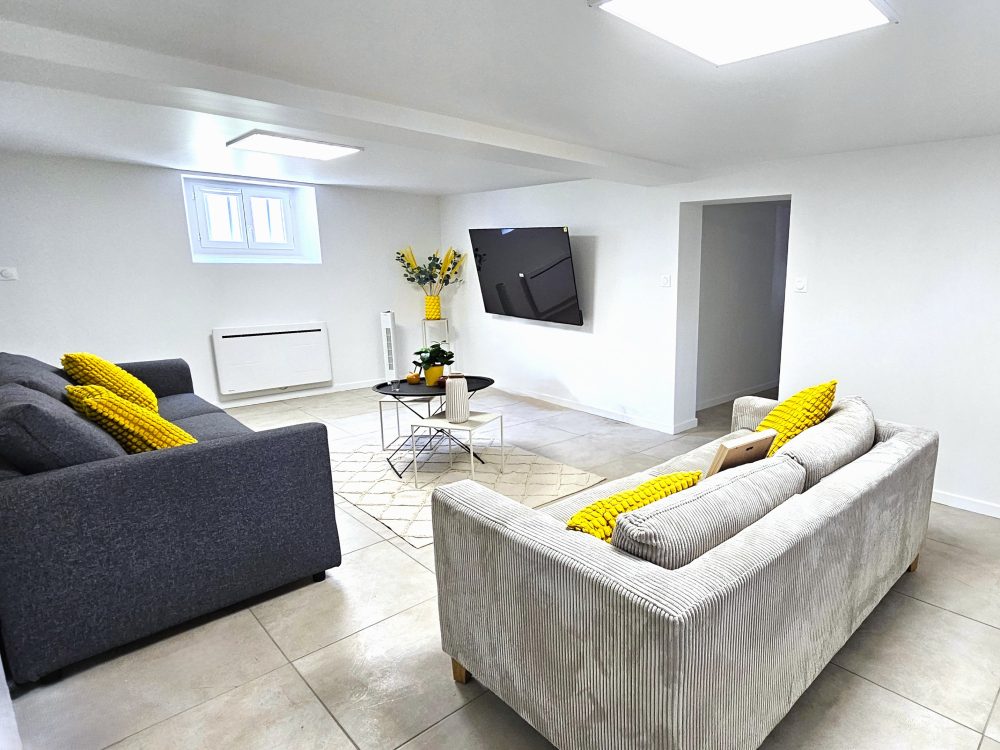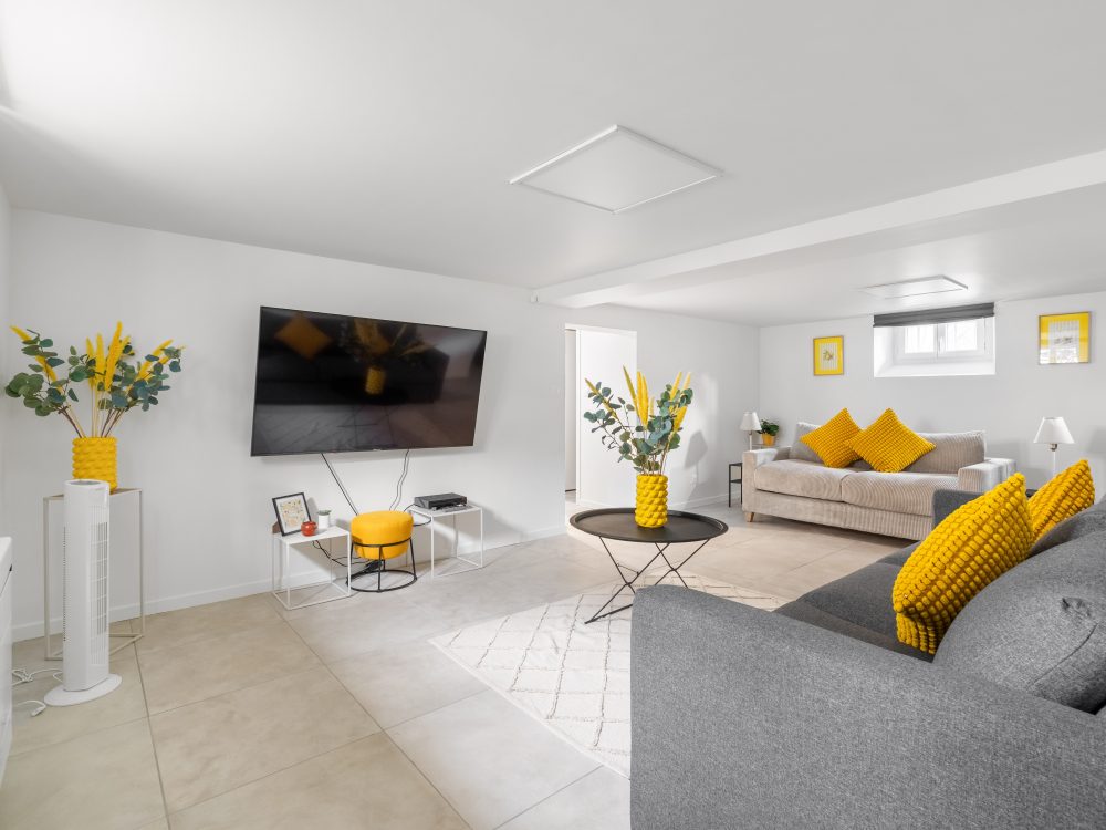 - Séjour cathédrale lumineux traversant de 53 m², donnant sur la terrasse et jardin.