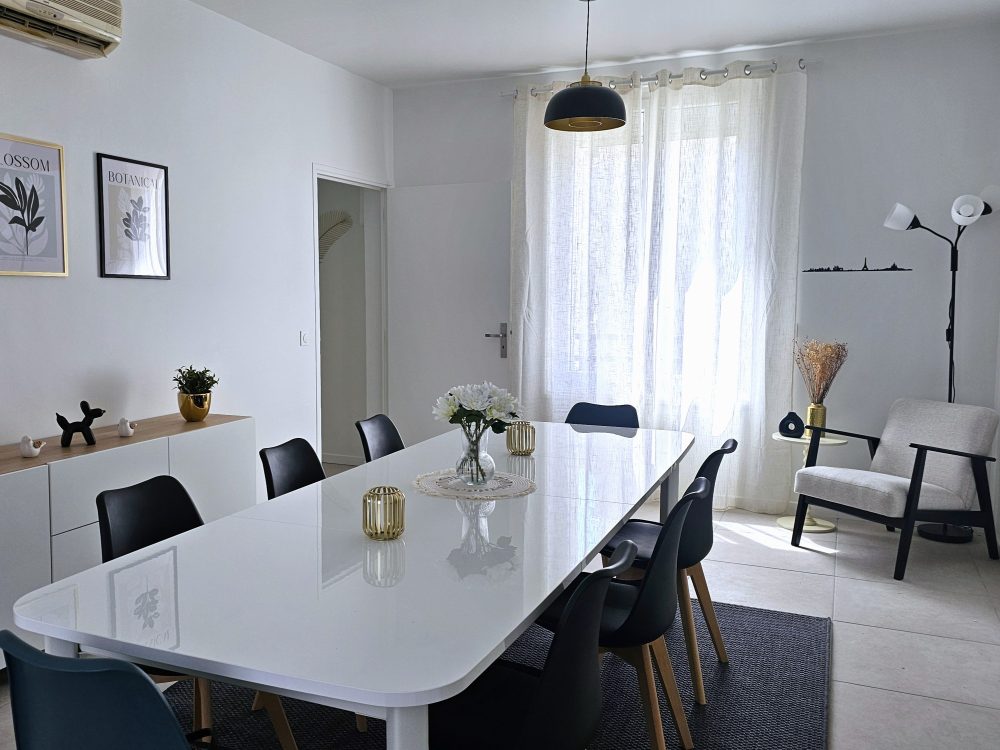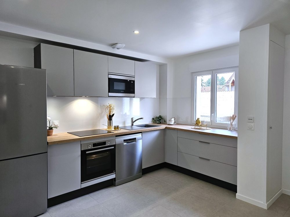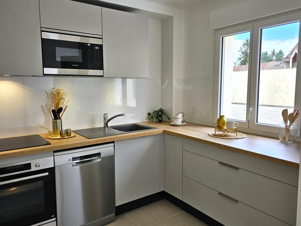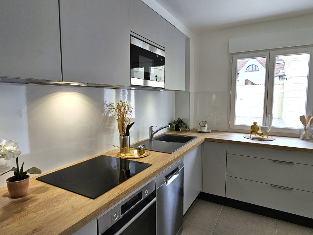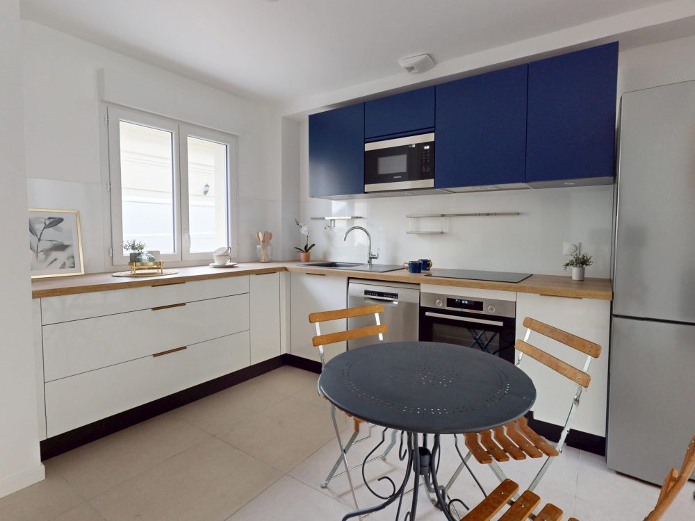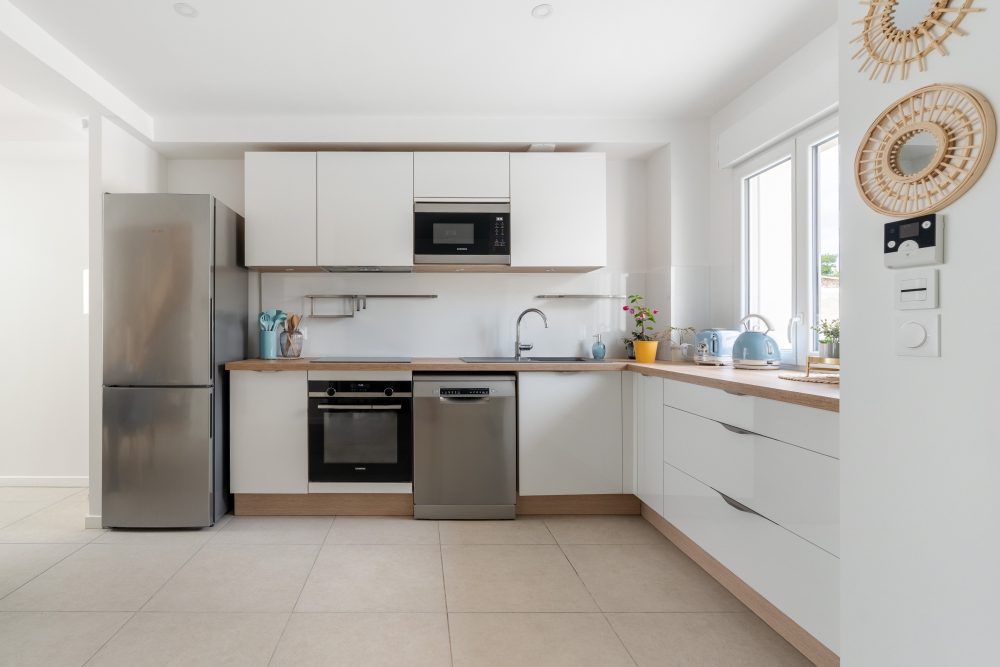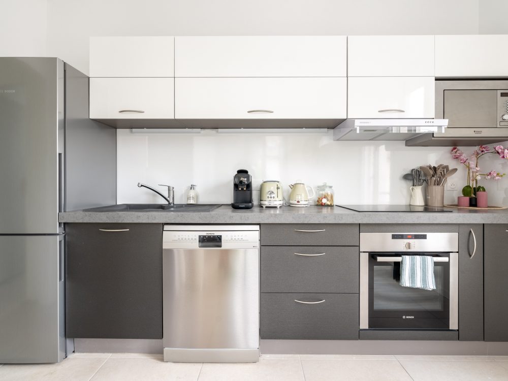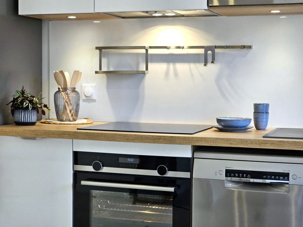 - Cuisine ouverte entièrement équipée, électroménager neuf de grande marque (grand frigo-congélateur, lave-vaisselle, micro-ondes, plaques induction et hotte).